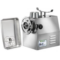 Carcassa e tramoggia in acciaio inox. Gruppo macinazione estraibile in acciaio inox AISI 304 - ventola di raffreddamento - bocca ingresso carne ø 76 mm - microinterruttori di sicurezza su tramoggia - inversione di marcia - riduttore con ingranaggi a bagno d’olio. In dotazione sistema enterprise con piastra inox (fori ø 6 mm) e coltello inox autoaffilante