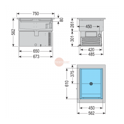 Drop in refrigerato. Ideale per mantenere freschi alimenti e dolci. Struttura in acciaio inox AISI 304. Possibilità di contenere teglie 600 x 400. Sbrinamento automatico. Refrigerazione ventilata. Evaporazione condensa automatica. Gas refrigerante R404a.