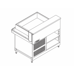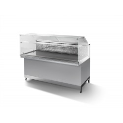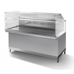 Nella versione caldo bagnomaria il piano espositivo è costituito da una struttura rialzata adatta a sostenere vaschette gastronorm o vassoi forati. La vasca è costituita da un unico involucro inox saldato a tenuta dotato di carico e scarico acqua manuale. La temperatura di esercizio sulla vasca è regolabile tramite centralina elettronica fino ad un massimo di 80°C. Il sistema è dotato di un sensore di sicurezza che interrompe il funzionamento nel caso in cui il livello dell’acqua sia sotto il limite minimo.