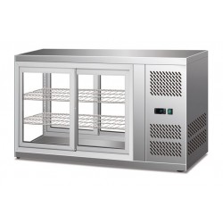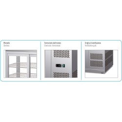 Vetrina da banco capacità 110 litri. Superficie interna ed esterna in acciaio inox. Termostato elettronico. Illuminazione LED. Antine scorrevoli in vetro con chiusura automatica.