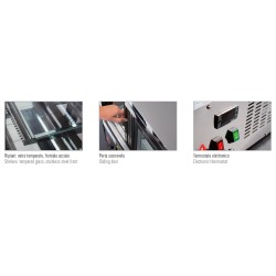 Vetrina da banco ventilata, porte scorrevoli, costruzione in acciaio inox AISI 304, 2 mensole intermedie.