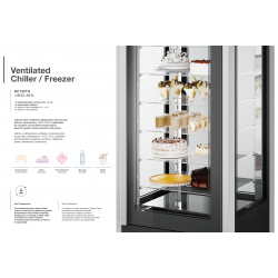 - vetrina a refrigerazione ventilata con sbrinamento a gas caldo, temperatura -18°C/+10°C, regolabile per temperatura negativa e positiva, l’ideale per gelato, semifreddi e pasticceria